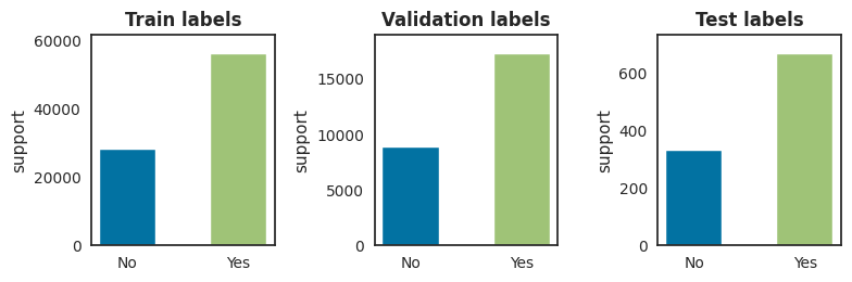 Now that we have created labels for the training, validation and test set, we can immediately have a look at the class proportions to see whether the data set is balanced with regards to the classes.