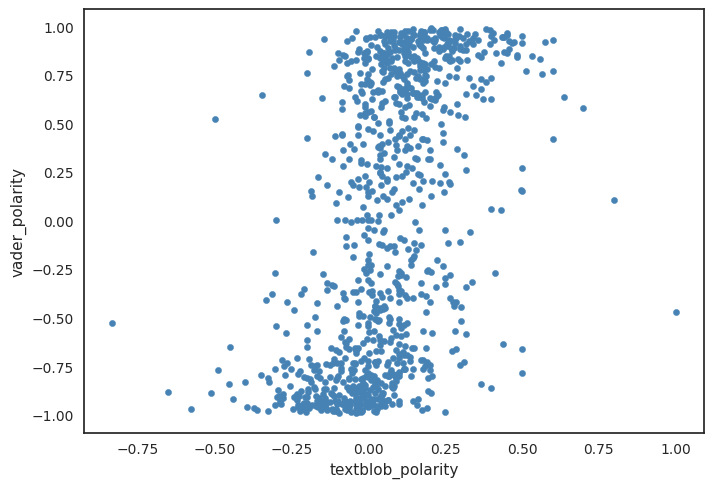 The Pearson correlation percent is 0.5, indicating no statistical relationship between both variables. Let’s also visualize the polarity scores for both classifiers and how they relate to each other. From the graph we can observe that the VADER polarity scores seem to be more negative, whereas the Textblob scores have a more positive polarity.