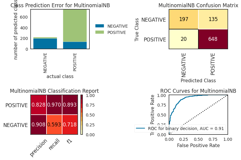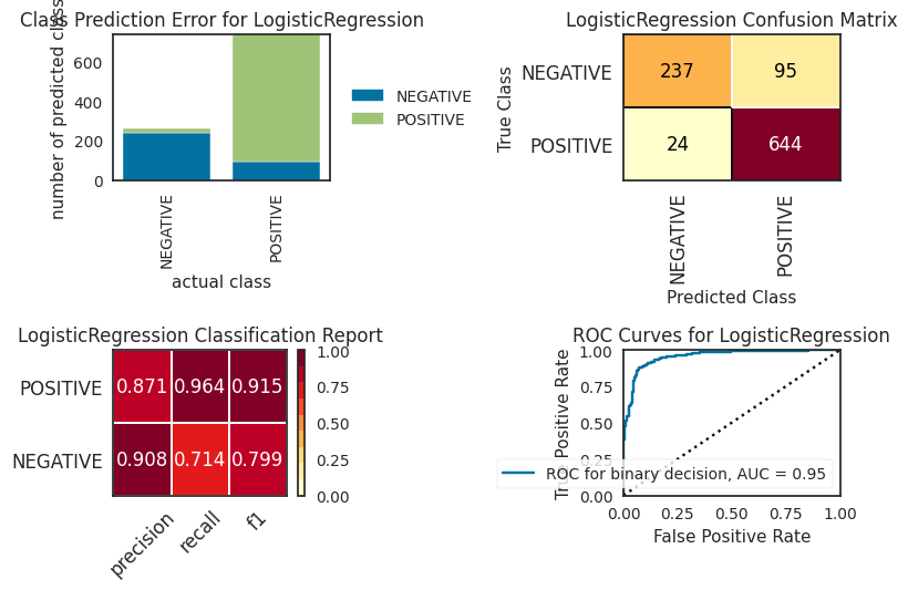 y_train_bin = np.array([1if x=="POSITIVE"else0for x in y_train])y_test_bin = np.array([1if x=="POSITIVE"else0for x in y_test])def plot_performance(model): fig = plt.figure(figsize=(14, 14)) fig, axes = plt.subplots(2, 2) cl = ["NEGATIVE", "POSITIVE"] visualgrid = [ ClassPredictionError(model, classes=cl, ax=axes[0][0]), ConfusionMatrix(model, classes=cl, ax=axes[0][1]), ClassificationReport(model, classes=cl, ax=axes[1][0]), ROCAUC(model, classes=cl, ax=axes[1][1], binary=True), ]for viz in visualgrid: viz.fit(X_train_tfidf, y_train_bin) viz.score(X_test_tfidf, y_test_bin) viz.finalize() plt.tight_layout() plt.show()