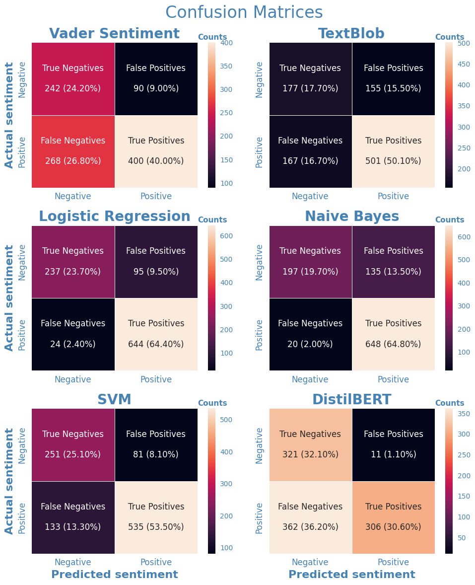 labels = [0, 1]clf_dict = {'vader': 'Vader Sentiment',"textblob": 'TextBlob',"lr": "Logistic Regression",'nb': "Naive Bayes",'svm': "SVM",'fl': 'DistilBERT'}cm_dict = {}for k, v in clf_dict.items(): new = k +"_binlabel" cm_dict[k] = confusion_matrix( results_df["actual_binlabel"], results_df[new], labels=labels )