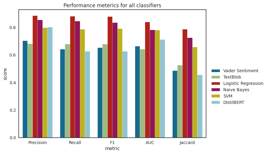 We can observe from the comparison graph that the logistic regression classifier has the best performance across all metrics. Overal feature-based methods seem to have the best out-of-the-box performance, outperforming rule-and embedding-based methods. For the rule-based methods, VADER and Textblob exhibited similar performance. Somewhat surprisingly, the embedding-based model did not outperform the other feature-based classifiers, but exhibited similar performance as the rule-based methods. It should be noted though that we used a sentiment analysis model that was trainined on the IMDB movie reviews data set. So, this data set might not be entirely representative. Becaue we were only interested in out-of-the-box performance for the scopoe of this study, we did not fine-tune the model further. However, it is expected that further finetuning the model on our training set with drug reviews will result in performance gains.