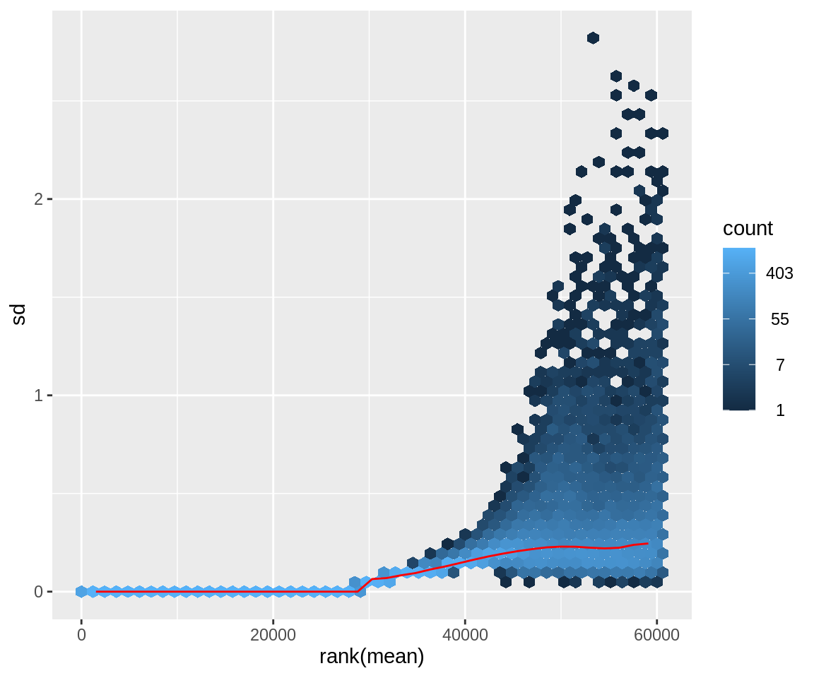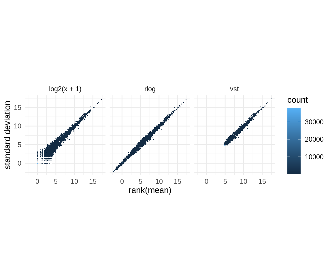 Although we will use the raw count data for our statistical analyses, we will also will compute some transformations, which we will use to visualize the data. More specifically, we would like to remove dependence of the variance on the mean. This is particularly importat because the log transform of count data exhibits high variance when the mean count is low. Therefore, we will apply rlog and vsd transformations, which are two transformations for count data provided by the DESeq2 package [Love et al., 2014]