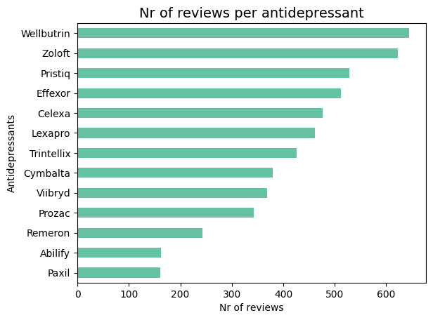 We can see that all compound names are mapped to brand names. Now that we have normalized nanmes for the most commonly used antidepressants, let’s have a look at the number of retrieved reviews per drug.