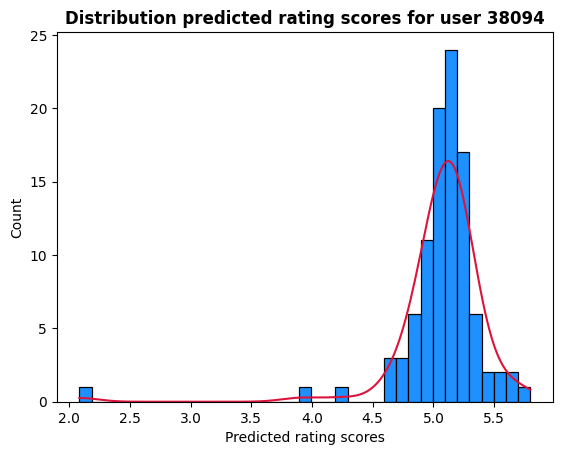 We can also inspect the distribution of the predicted ratings for out test user. We can observer that the scores follow a normal distribution with mean rating around 5.