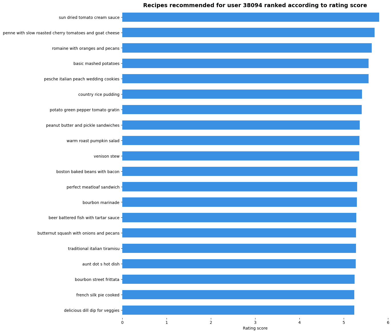 f"Recipes recommended for user {test_user} ranked according to rating score",