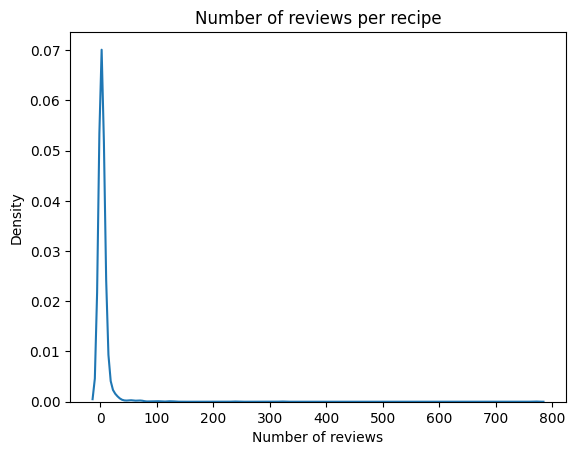 When we plot the number of reviews per recipe using a density plot, we can see that the food recipes data set also exhibits the long-tail pattern.