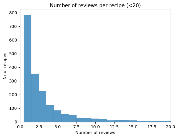 sns.histplot( counts_df, bins=800, discrete=True,)plt.xlabel('Number of reviews')plt.ylabel('Nr of recipes')plt.xlim(0,20)plt.title('Number of reviews per recipe (<20)');