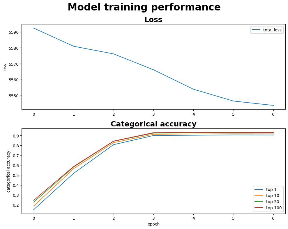 We can plot the loss and top K accuracy to assess training performance. We can see that loss is decreasing and accuracy is increasing during training.