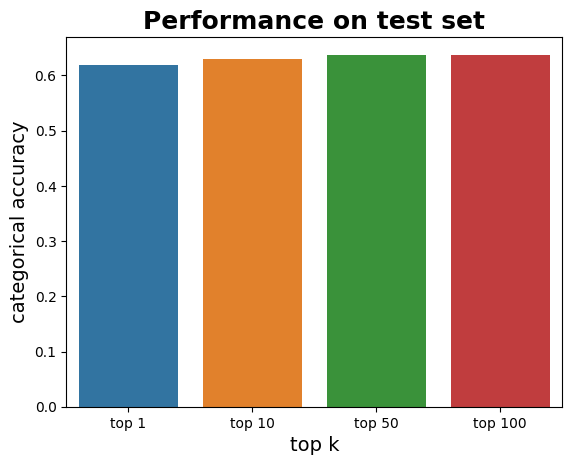 sns.barplot(results_df)plt.title('Performance on test set', fontsize=18, fontweight='bold')plt.xlabel('top k', fontsize=14)plt.ylabel('categorical accuracy', fontsize=14);
